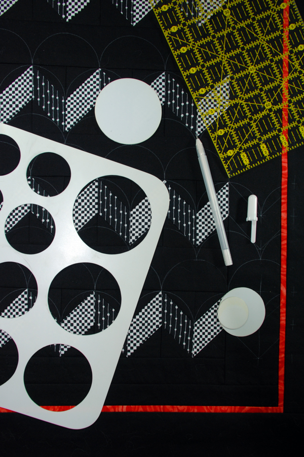 I’ve been working on a wild little “black and white and red all over” type quilt, and before I could get to one of my favorite parts–that would be the machine quilting!–I had to mark it. Well, I didn’t have to mark it I suppose, but I didn’t think trying to freehand quilt a bunch of oversized clam shells was going to end well. My perfectionist side would have come out of the corner screaming the minute things started to go wonky, as they undoubtedly would without some premarking!