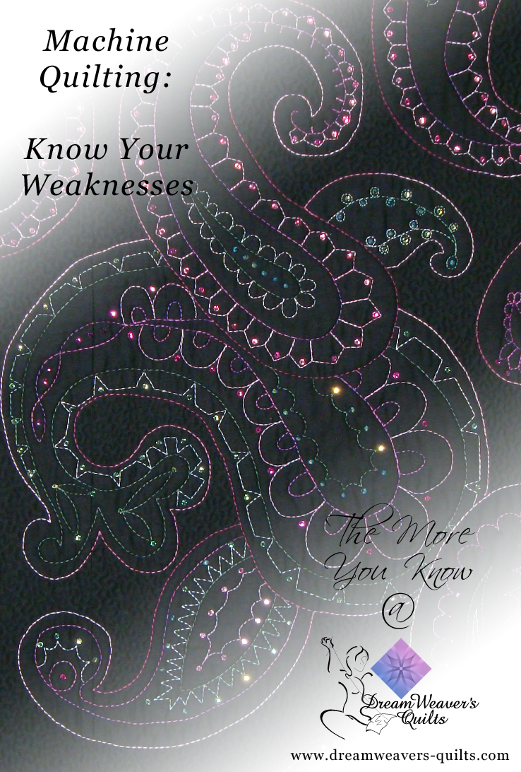 In Part 2 of The More You Know @ DreamWeaver’s Quilts, Machine Quilting Edition, we talked a bit about checking your quilting design for trouble spots where you might be stitching over multiple layers of fabric that could cause the presser foot to hang up, making stitches smaller, uneven or just wonky. Being prepared by marking those spots in the pattern, repositioning your hands and the quilt for more control when approaching those trouble spots, and slowing down or even stopping the machine to make one stitch at a time can help keep free motion quilting stitches even over those rough patches.