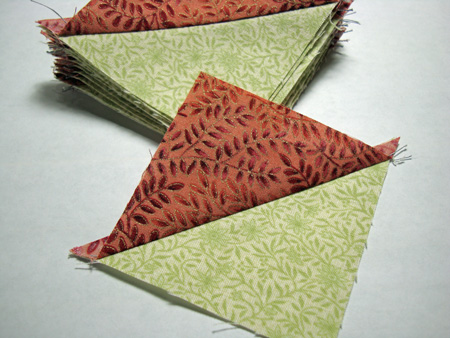 Well, I’ve got a news flash for you: it’s not you or your sewing skills, it’s the math. And I don’t mean that you or the pattern designer have miscalculated the cutting sizes either. What I mean is that mathematically, when you calculate the size of square to cut for a certain finished size of half-square or quarter-square triangle, you won’t get a size that’s rotary cutter friendly. It’s some algebraic formula like Asquared+Bsquared=Csquaredyaddayadda, and I did actually do the math a couple of years back though I don’t remember the formula at the moment.